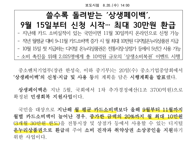 본 포스팅은 중소벤처기업부 공식 발표자료를 바탕으로 작성되었습니다. 자세한 내용은 상생페이백 공식 누리집에서 확인하실 수 있습니다.
